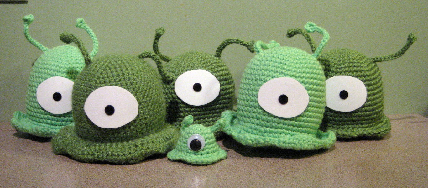 I don't normally take commissions, but when a friend asked for a few Futurama brain slugs so that she could go to a Halloween party with a group of friends dressed as recent visitors to the brain slug planet I couldn't resist. I used the wonderful brain slug pattern created by Hook & Needles and bought cheap hair bands at a dollar store that can be threaded through the bottom of the brain slug to keep it on one's head. This was a great way to use up some leftover green yarn and I think that making the slugs in various shades adds character. That same friend recently told me that she likes to put her brain slug on when she's feeling under the weather because that cloudy headed feeling you get when you have a cold is probably a lot like falling victim to a brain slug. Now is it safe to have this many brain slugs in one location? I guess it's okay, as long as you have enough garlic shampoo on hand!