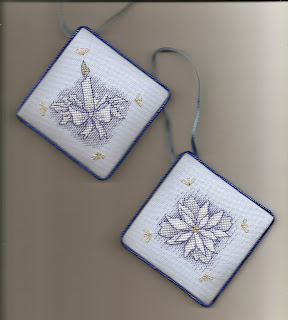 I've had the Dimensions leaflet for these blue ornaments on my cross stitch bookshelf for quite some time and I'm happy I finally got a chance to use it. The pattern is Martha Edward Glass's Holiday Elegance. I'm pretty sure it's out of print now, but a watchful eye may be able to find it on ebay.