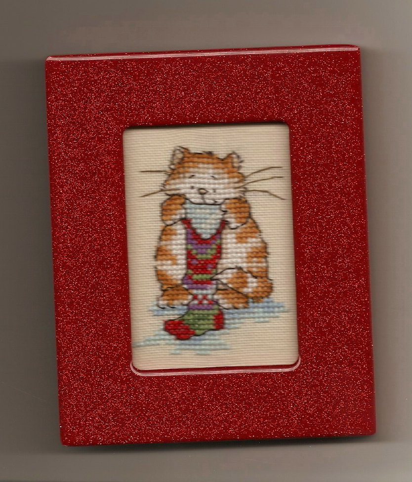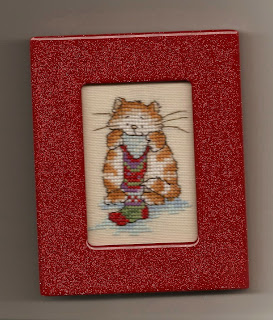 These mice were stitched over 2 threads on a 32 count Belfast linen in Cream. The frames are tree hanging picture frame ornaments that I found at Michael's. I thought they were cute, and they kind of look like jam jar lids, don't they? Plus, they were easy to mount the cross stitch fabric in - a welcome relief after struggling with my circular foam-backed cardboard ornaments!
